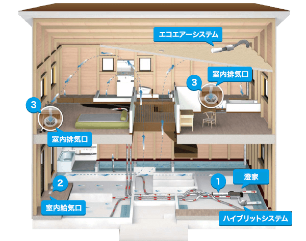 マーベックス澄家は、ダクトレスで新鮮な空気を床面の給気口から室内に給気して、床面の排気口を通り床下のダクトを経由して外部に排気します。