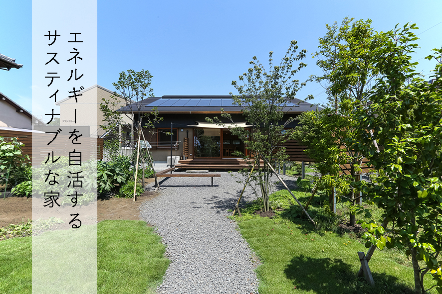 富士宮市で自然エネルギーを有効利用する「OMソーラー」と「太陽光発電」を取り入れた省エネルギーハウス。正面から見ると1階建てのように見えて、2階のスペースもあり、ウッドデッキを広くとった分、軒を伸ばして、リビングからウッドデッキ、庭への流れを広いひとつの空間として有効に使えるようにしました。家の中から、外へ。外から中へ。繋がりのあるLOHASらしい木の家です。 [仕様] OMソーラー+発電 延床面積:122㎡(30.31坪) 屋根:ガルバリウム剛板 エバールーフ葺き 軒裏:杉板貼り 外壁:ガルバリウム剛板+そとん壁 床:1階、2階_富士ひのきフローリング 玄関ドア:ユダ木工 ラスティック玄関ドア サッシ:トステム シンフォニーM
