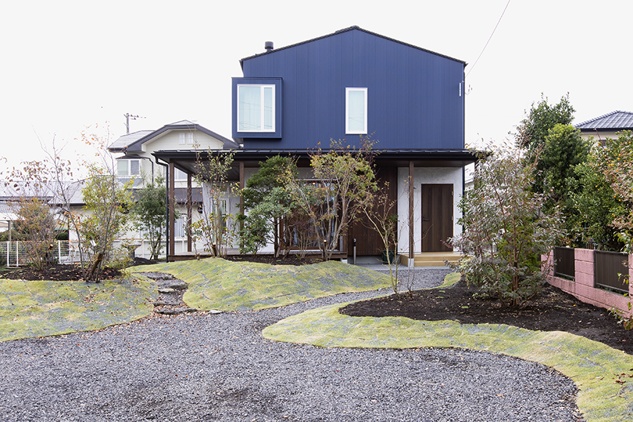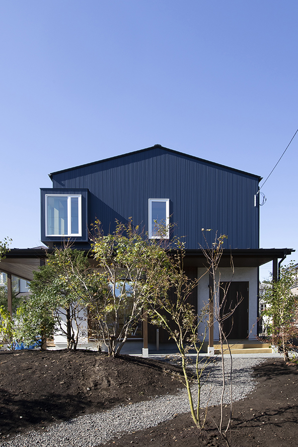 ブルーの外壁はガルバリウム鋼板、白い外壁は薄塗壁(そとん壁)です。一部杉板も使用しています。