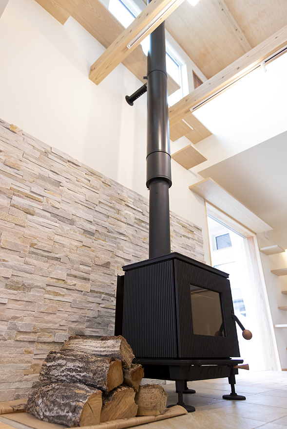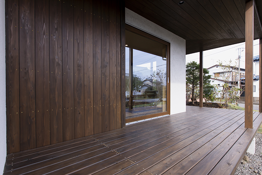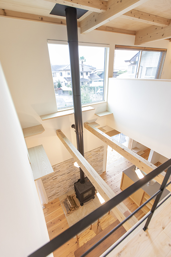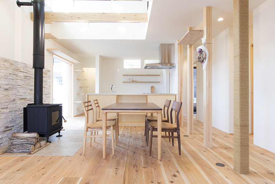[仕様] 延床面積:118.41㎡(35.75坪) 屋根:ガルバリウム剛板タテハゼ葺 外壁:ガルバリウム鋼板、そとん壁、一部杉板貼り 床:1階、2階_飫肥杉(おびすぎ)無垢フローリング厚30mm サッシ:トリプルスマージュ(三協立山アルミ)
