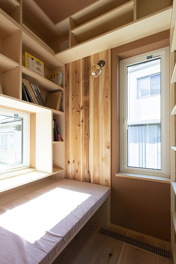 結果、ぐるりと一周本棚になりました。ちょっとしたベッドも作りましたが、その下にも本を収納できるようになっています。