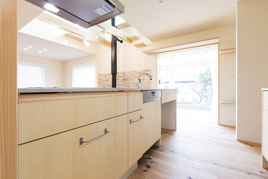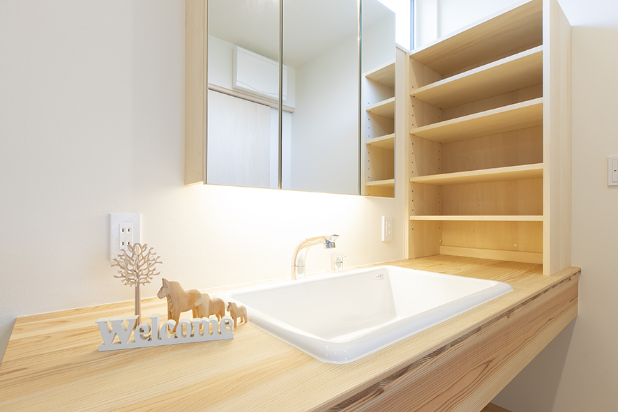 洗面まわりには、ストック品が確保できるように多めの収納棚を設けました。