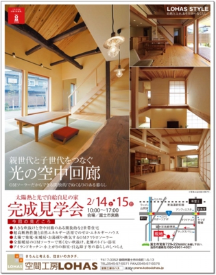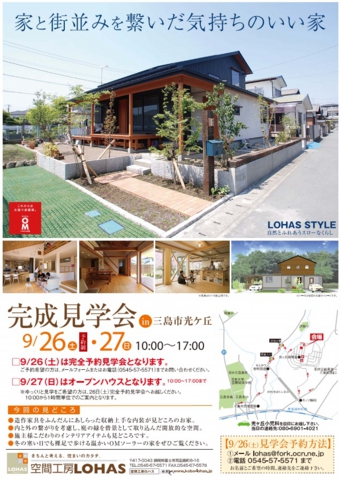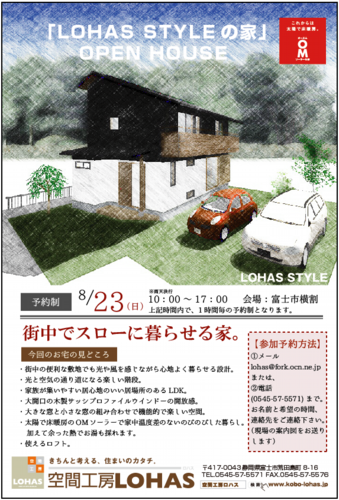 ・日時:8月23日(日)10:00~17:00で1時間毎の予約制。・場所:富士市横割・LOHAS STYLEの家OPEN HOUSE・予約制(駐車場に限りがあるので予約制とさせて頂きます)・街中でスローに暮らせる家<予約方法>