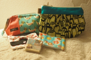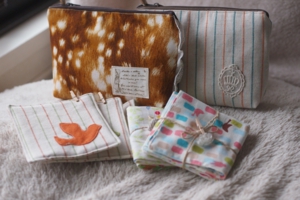 お子様の小さなポケットにも収まる可愛らしいガーゼハンカチや、ちょっとした小物いれに使えるポーチやコースターなど多彩な布でハンドメイドした柔らかい作品達が並びます。