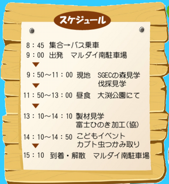 SGEC承認林から算出された地元の名産『富士山檜輝』の森へ行こう!参加費 大人1,000円こども 無料<もちもの>お弁当・飲み物・虫カゴ<スケジュール>