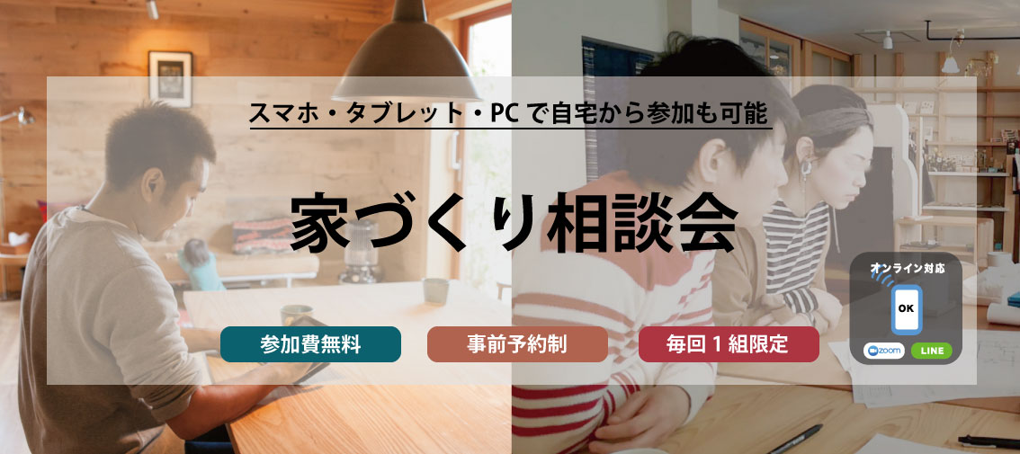 新型コロナウイルス感染拡大防止のため、自宅に居ながら、スマホ・タブレット・PCからオンラインで参加できます。Web会議ツール(ZOOM)を使って、ご来社いただく勉強会と同じように、ご自宅に居ながらテレビ電話で受講ができます。事前に資料をお送りして資料を御覧いただきながらビデオ通話で家づくり必要な知識を身につけられます。まだ、小さな子供が居るので出掛けにくい方にもおすすめです。