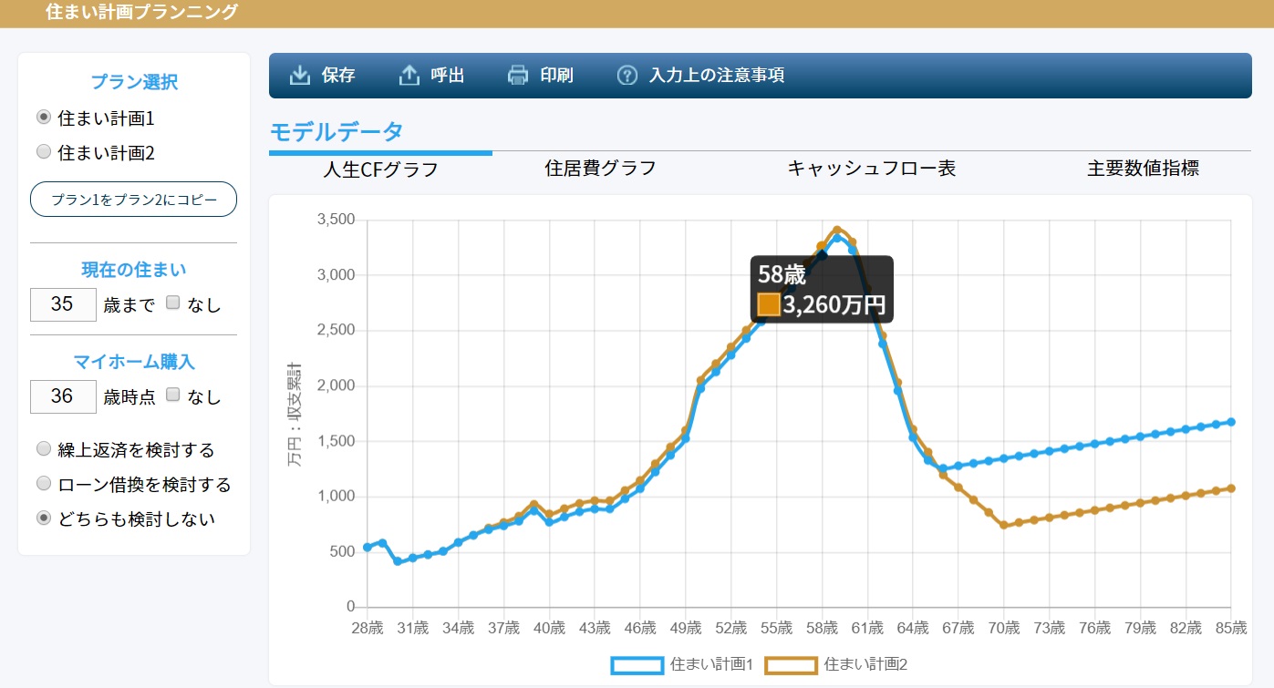 というソフトを使い、予算や時期、優遇制度、住宅ローンについて幾つもの選択肢を検討していけます。そして85歳までのお金の人生計画であるライフプランシュミレーション