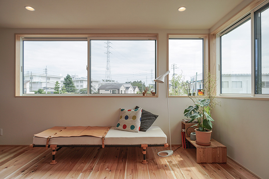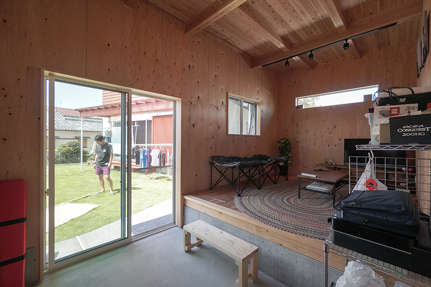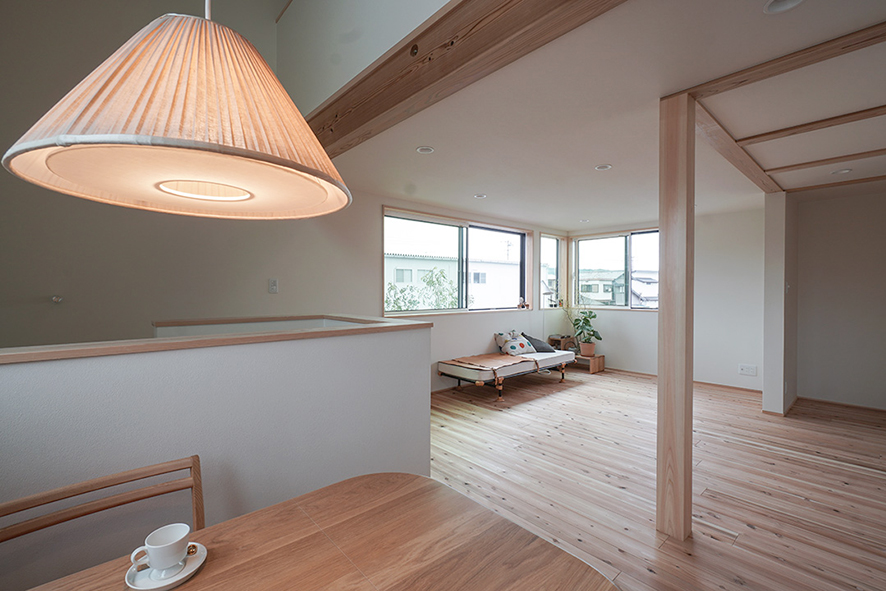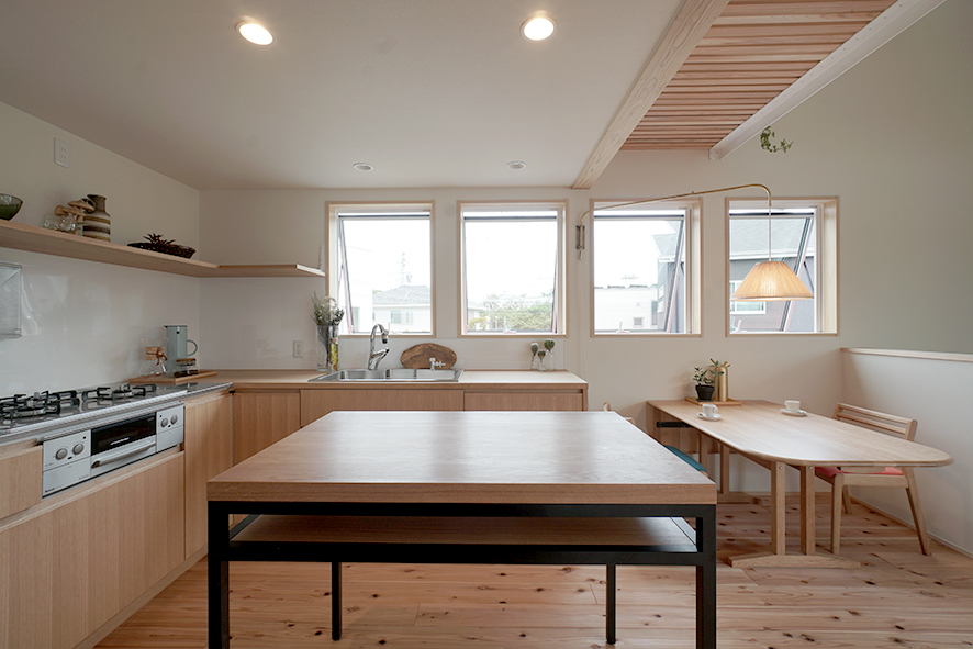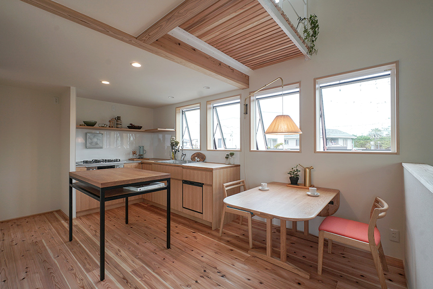 なるべく仕切りを外したリビングダイニングでは、東面に設けた窓のおかげで、朝から心地よい光を浴びながら食事を楽しめます。外には小屋があり、ご主人のサードプレイスとして、好きな作業を思う存分に愉しむことができます。