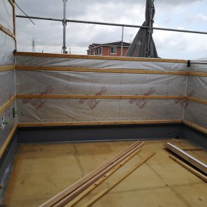 通常のバルコニーの手すり壁よりも少し高めに作って、周囲の視線が気にならないようにしています。寝室から大きな窓でベランダに出れます。 出来上がると、日よけ対策で大きなタープを張っていきます。