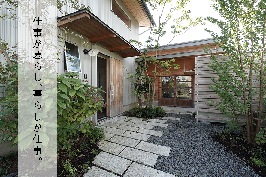 場所は「あさひの社」という、建築家 田中敏溥さんが設計・監修を手がけた分譲地。駿河湾を下に望む美しく整理された素敵な土地に建ちました。しばしば雑誌BRUTUS でも取り上げられる DWELLの川畑健一郎さんとLOHASがコラボして進めたお宅。ご主人の仕事が植木職人であるため、外に仕事場となる小屋を設け、体が汚れたまま部屋に入らなくても済むように、外の小屋の隣にお風呂を造りました。母家の壁や土間の薪ストーブはご主人が手がけるというセルフビルドも取り入れた、家で仕事が捗る。家族への思いやり溢れる家になりました。