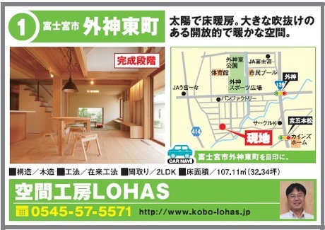 全館空調「パッシブエアコン」搭載 4世代の家族が暮らす家。 延床約52坪。大人が多くそれぞれの個室を設けた7LDKの間取り。 空気をデザインするOMソーラー開発の全館空調“パッシブエアコン”で全館温度差が無い暮らしを実現。長期優良住宅で耐震等級は最高等級の3以上。断熱性能は長期優良住宅の1.5倍以上の、大きな大屋根が印象的な家となりました。 会 場 : 富士市依田橋町 時 間 : 10:00~17:30