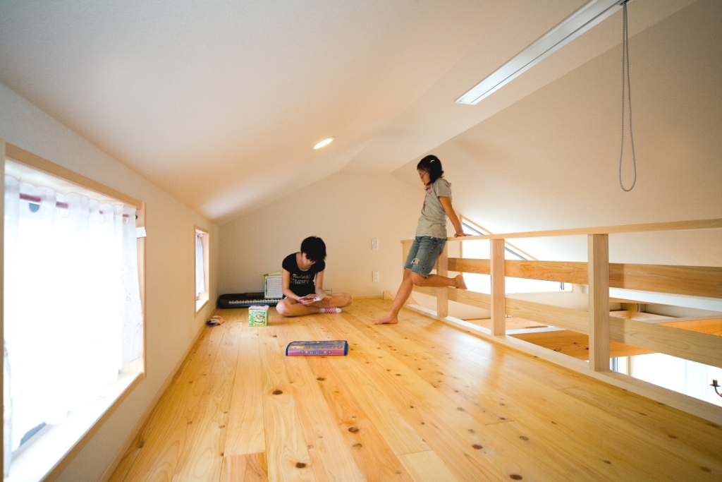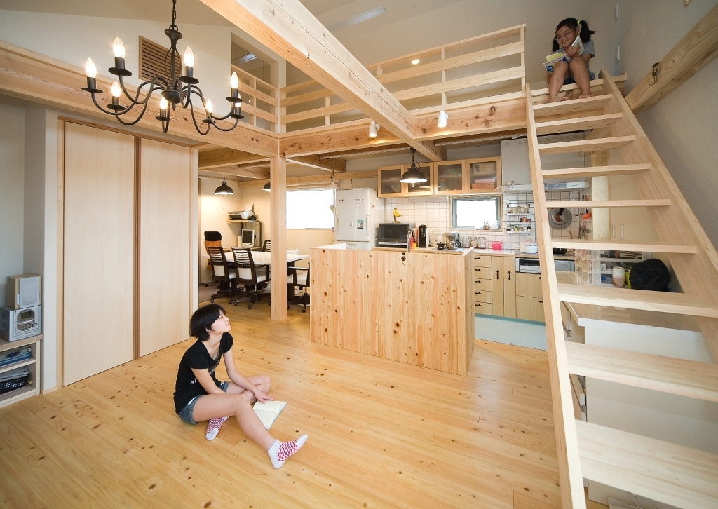 ご夫婦とお子様二人の家族4人で暮らす家。約32坪。・太陽の恵みで床暖房。OMソーラーの家。・地元の山で育った富士ひのきの構造と床。・リビングからは富士市街と駿河湾の眺望を独り占め。・2階は4人それぞれの個室があり、子供部屋はロフトをベッド代わりに。