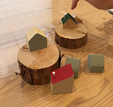 英語を使って木工教室。端材で木のおうちを作ります。屋根に色を塗ったり、石などの自然素材を並べたりして、丸太を輪切りにした台座の上に自分だけのおうちとお庭を作ります。小さな子も参加可能です。大人も大歓迎。