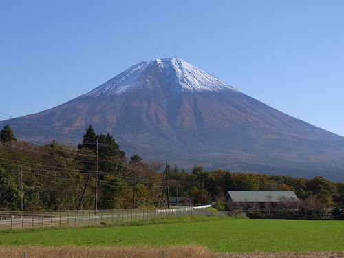 かくあるご当地の富士山も、遠目に見ても裾野に紅葉の色づきが感じられます。 やはり、頭に雪を頂いて、済んだ秋の青空とのコントラストが綺麗だと思います。 車で走っていて、これは綺麗だと思っても、車を停めて写真を撮るタイミングがなかったりします。 数日前の景色のほうが雪が多かったし良かったかもしれません。 でも、今朝のもじゅぶんいいと思います。